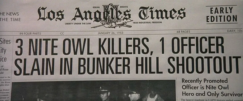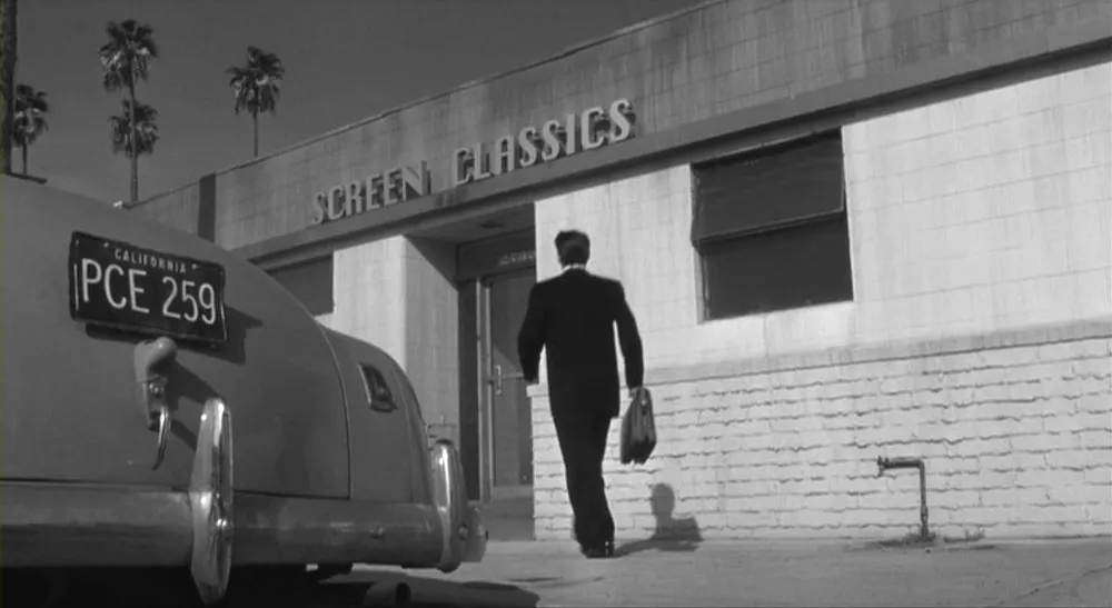 Even more implausible, some of them are optically distorted—a practice that didn’t become common until the advent of digital typesetting, and in fact would have been practically impossible in 1950s newspaper printing. Another glaring anachronism is the sign on the “Screen Classics” building which is set in Chicago, the original Macintosh system font (TrueType version, 1991). This is very strange to see, as the sign is composed of large, apparently hand-constructed three-dimensional letters mounted on the building.