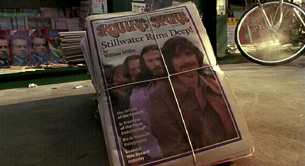 Almost Famous (2000, Dreamworks SKG). This is Cameron Crow’s fictionalized (and entertaining) account of how he started writing for Rolling Stone magazine. It’s supposed to be 1973, a year I remember very well. I have to say they did a very good job of capturing it, but then, it wasn’t that long ago. Still, there are ample opportunities for type flubs in a movie about a guy who writes for a magazine. Surprisingly, not a lot of type is shown on screen, and what little is shown is correct for the period (the pre-ITC version of Kabel Black for instance). Except for one little thing near the end of the movie. Had I not been an avid Rolling Stone reader back in the seventies, I might have missed it. There is a montage which includes a close-up of a stack of RS just dropped off at the newsstand. It features aspiring young writer Will’s triumphant first cover story.