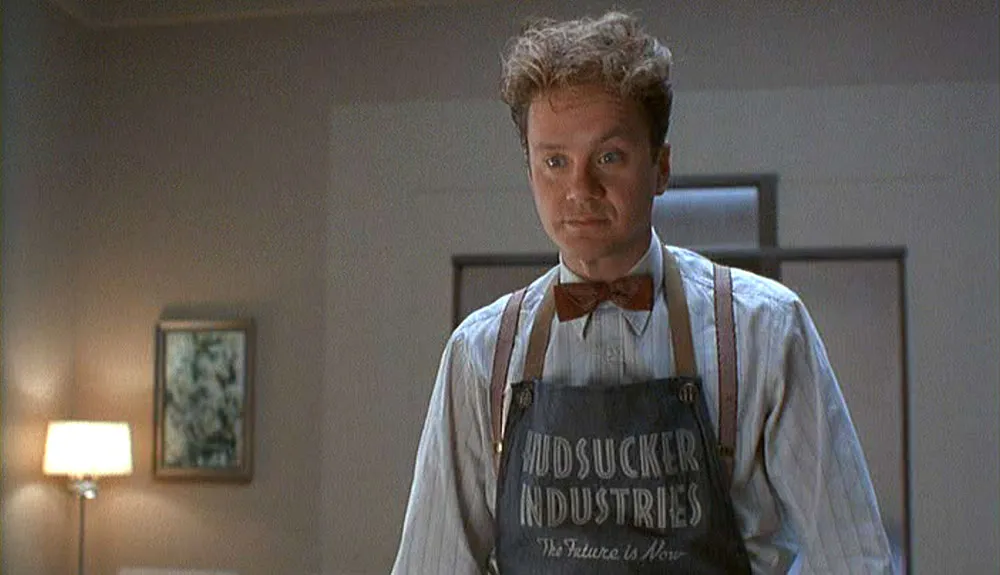 The Hudsucker Proxy (1994, Warner Bros.). I’m a big fan of the Coen brothers’ movies and this is a favorite of mine. Typographically, though, their films are a mixed bag. One complication with critiquing the typography in this movie is that it’s difficult to say exactly what decade it’s supposed to be. According to the story, it’s set in the late fifties, but it often looks more like the forties, or even the thirties. Nevertheless, much of the typography is, at least technically, out of place. For the most part they’ve chosen typefaces that look the part but didn’t actually exist fifty years ago. A good example is the Hudsucker corporate logo which looks like it’s from the thirties or forties, but is actually set in Bodega Sans (1991).
