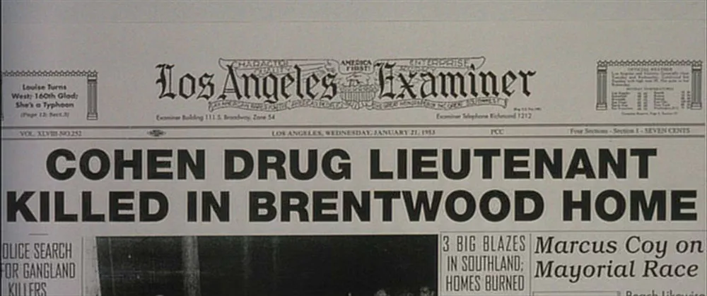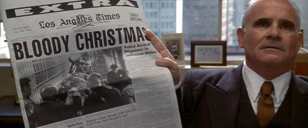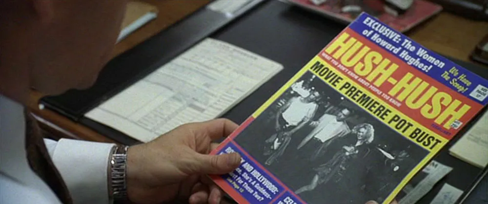 L.A. Confidential (1997, Warner Bros.). A highly regarded film, tightly written, well-acted, beautifully filmed, but pretty mediocre in its use of type. This one is set in the early ’50s, but the type was clearly not. “HUSH-HUSH,” a Hollywood gossip magazine, is featured prominently sporting a logo set in Helvetica Compressed (1974).