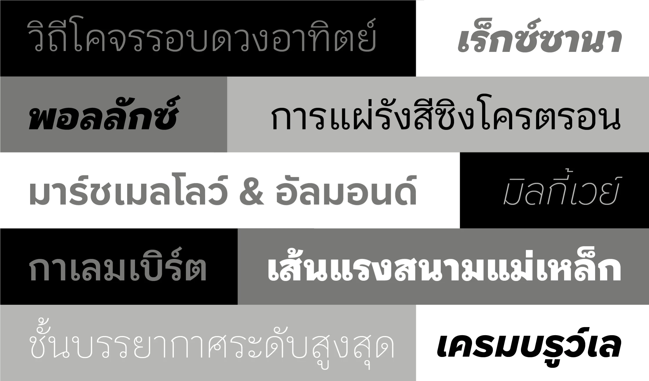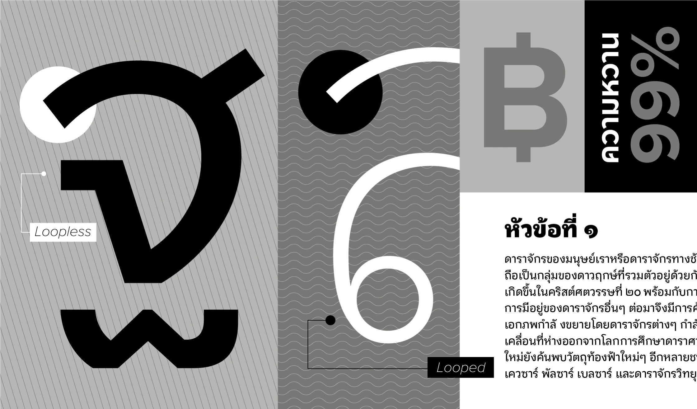- 2 versions: Looped is a more traditional style of the Thai script generally used for small text settings, and Loopless is a more contemporary style used for display typography.