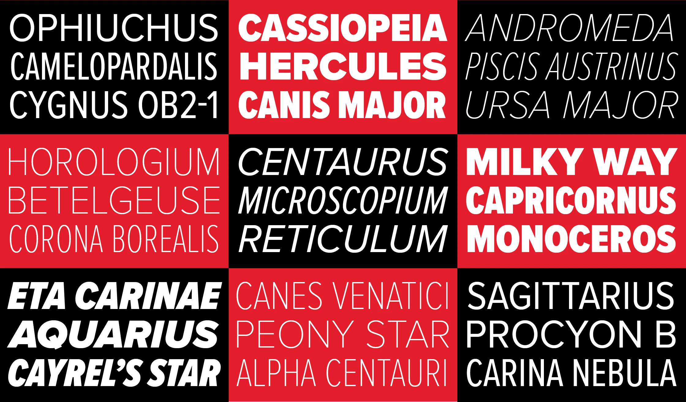 - Matching italics for all weights and widths as well as any arbitrary slant angle between roman and italic.