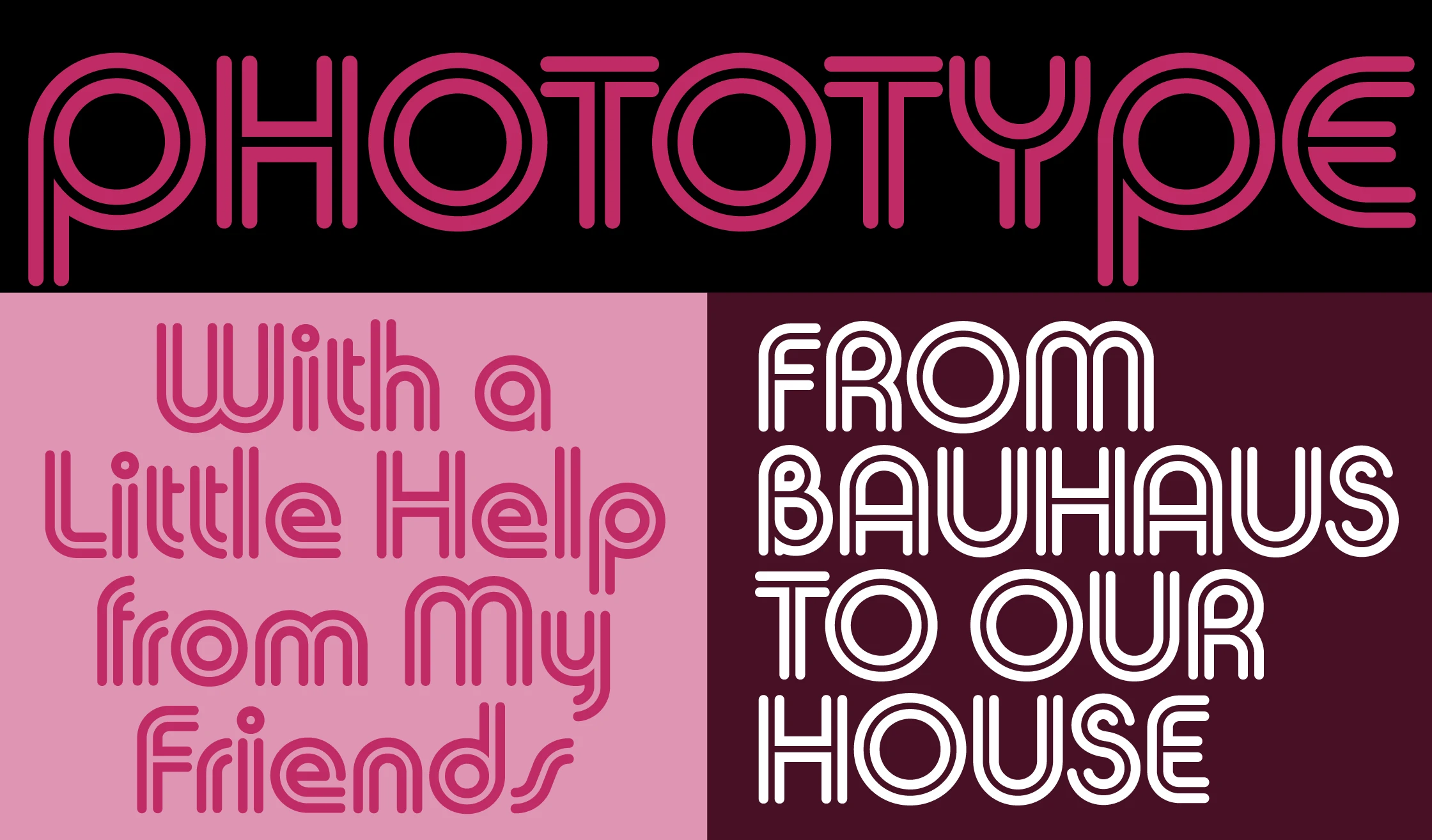 Skin & Bones was originally designed by Douglas F. Jones for the Visual Graphics Corporation, which made the Photo Typositor, a headline-setting machine. Jones was inspired by Herbert Bayer’s geometric alphabets as part of the Bauhaus movement and thought that an inline treatment would be visually appealing. In 2017, Doug gave Mark Simonson permission to create an official version of Skin & Bones, resulting in a faithful digitization of Doug’s 1972 design but with a larger character set.