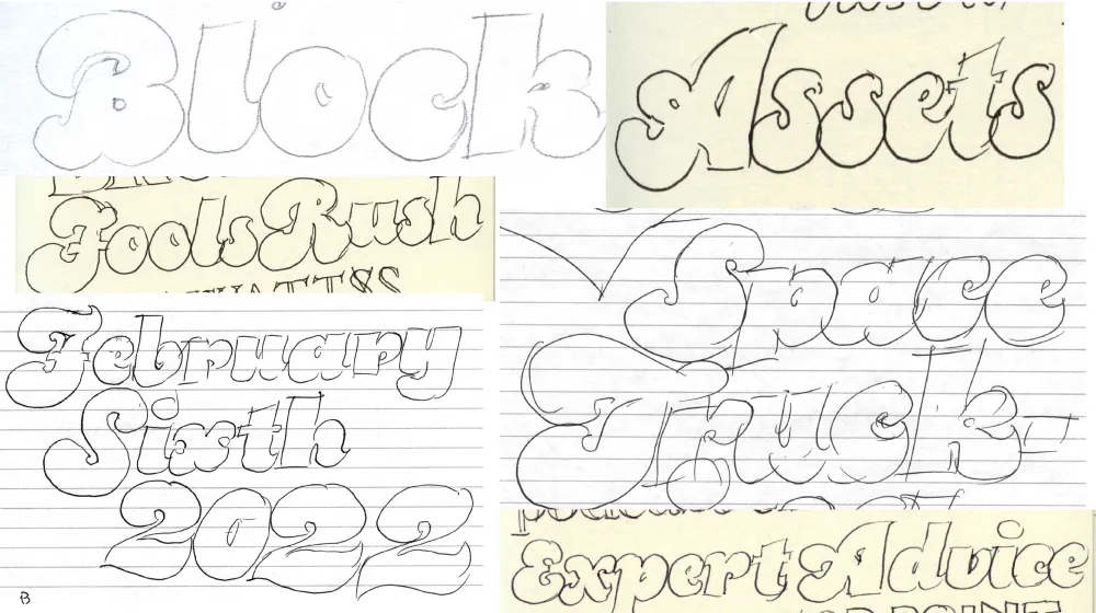 Madcap goes back to my high school years in the early seventies, before I was even thinking about type design. I worked on student publications and often did lettering in a cartoony, all-caps style, with overlapping letters. I was influenced by vintage MAD magazine and Hallmark and American Greetings’ psychedelic period.