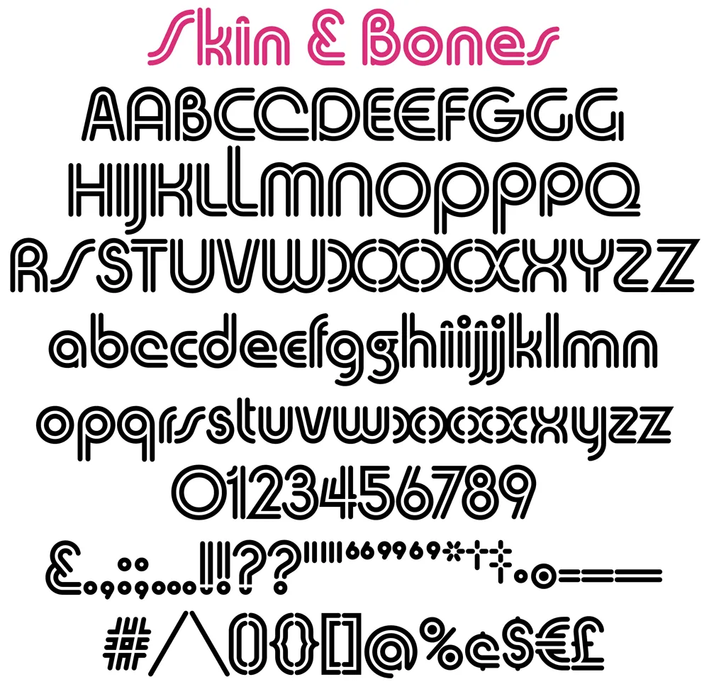 Unlike the original VGC film font, the digital version of Skin & Bones is carefully spaced and kerned so it automatically sets perfectly. It includes support for OpenType features like Named Stylistic Sets (to make it easy to use the alternate characters), Localized Forms, Subscript and Superscript, Fractions, and Ligatures.