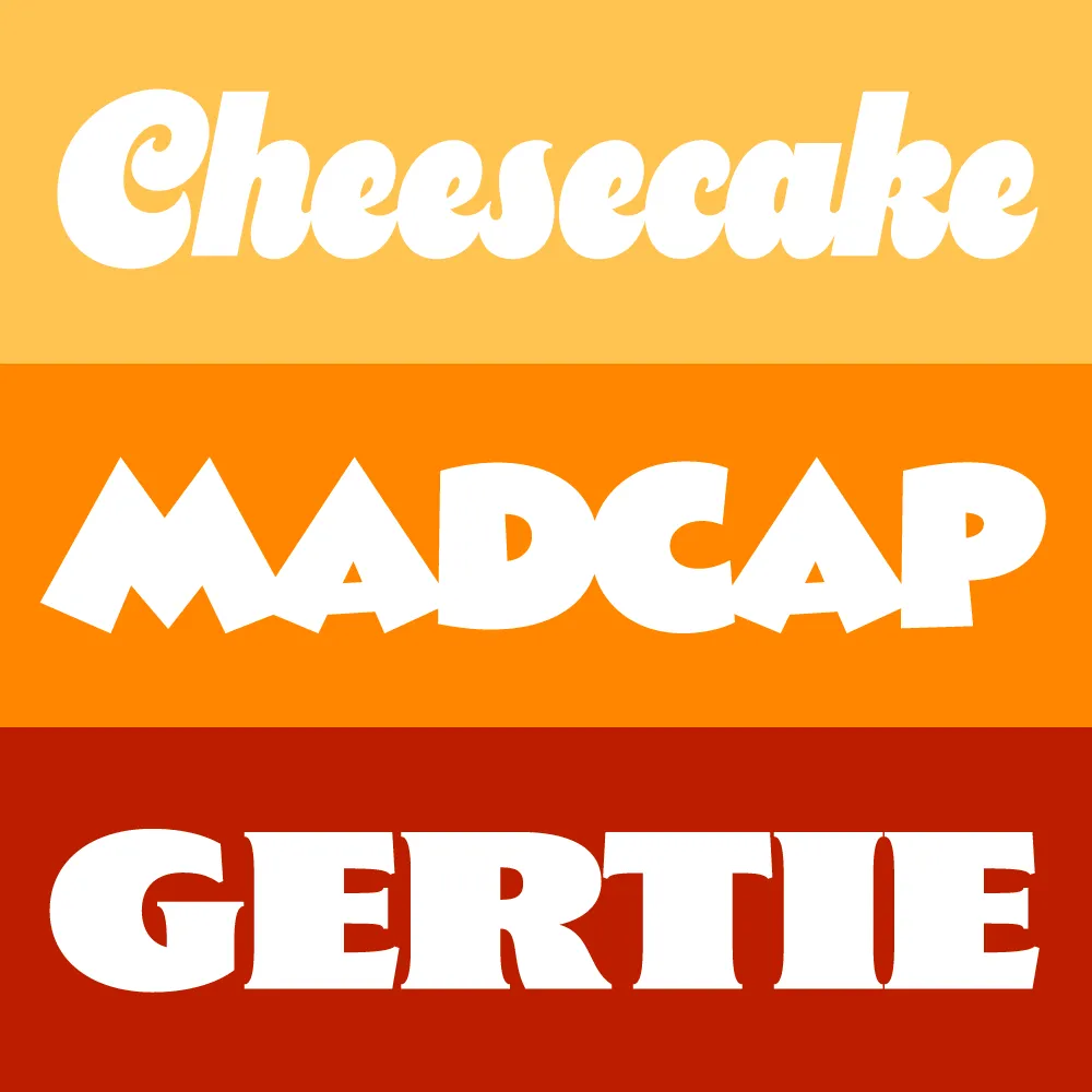 I took a break from my usual practice of working on larger families to create a trio of heavyweight display typefaces: Cheesecake, Madcap, and Gertie. They come from different historical periods—and different periods in my life.