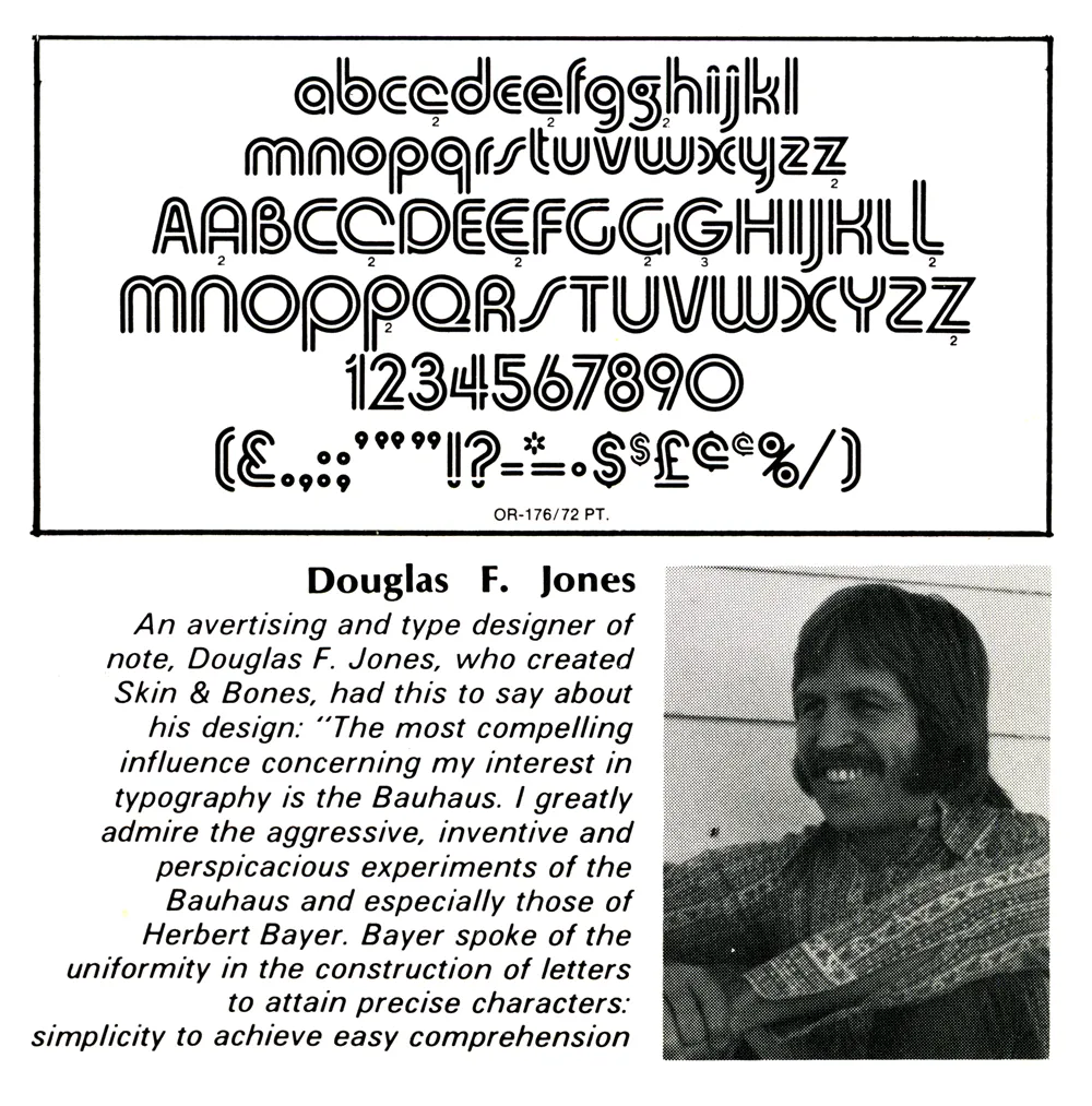 In 2013, I posted an item here about a magazine article I saw as a teenager back in 1972, which helped spark my interest in type design. It was about some recent typefaces released by Visual Graphic Corporation. VGC made the Photo Typositor, a machine for setting headline type. It included photos and short bios of the designers. One of them was Douglas F. Jones, designer of the typeface Skin & Bones.