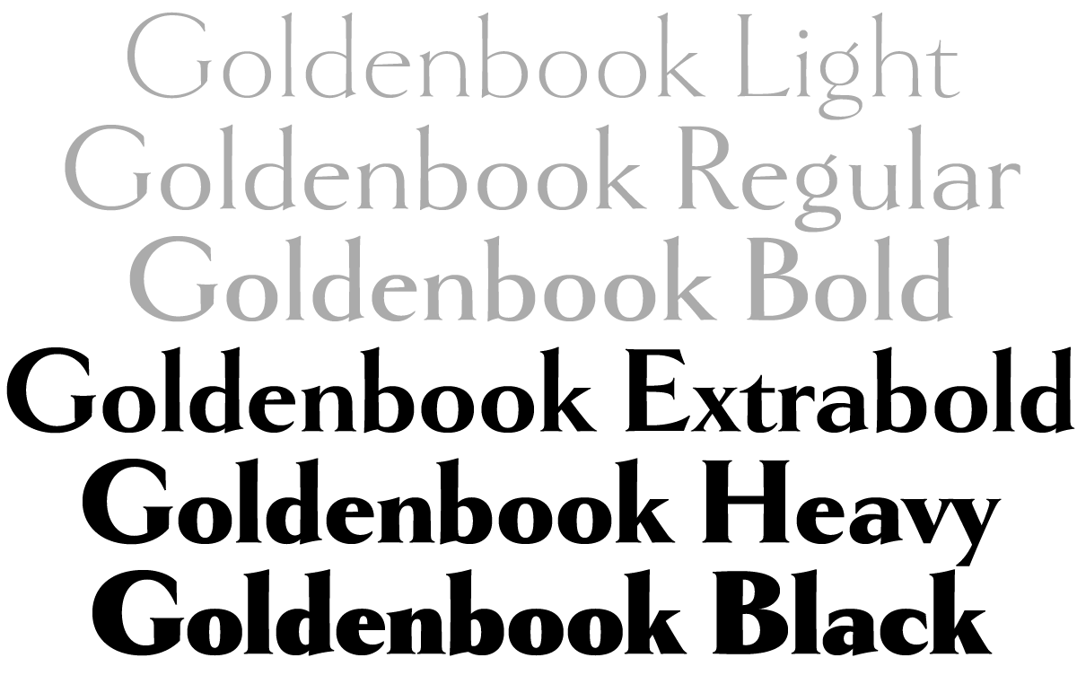 I first released Goldenbook in 2003 in three weights—Light, Regular, and Bold. It was based on the logo of the 1930s literary magazine The Golden Book. Over the years, I’ve made improvements to the fonts and added more language support, but this is the first major update.
