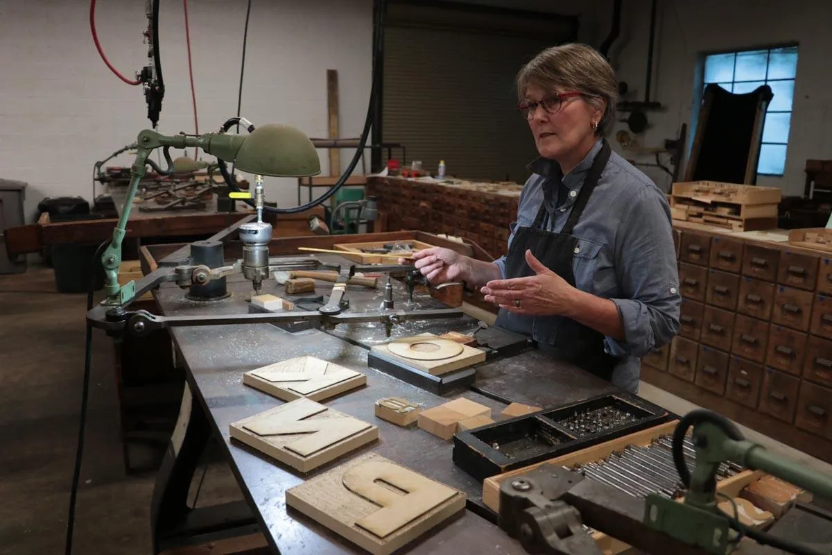 Production on the wood type version is just getting under way. Sample characters were cut last weekend at the Hamilton Wayzgoose by Georgie Brylski Liesch on the pantographic cutter (above) with hand trimming by David Carpenter (below).