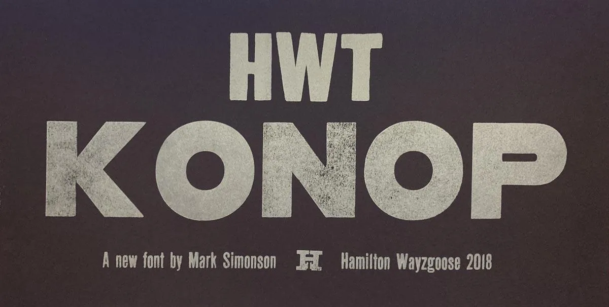 The digital version of Konop replicates the wood type version as much as possible, including the three different size designs. It includes OpenType stylistic sets that allow most characters to be rotated in place, 90° left, 90° right, or 180°, just like the wood type version. I also includes extra characters not available in the wood type version.