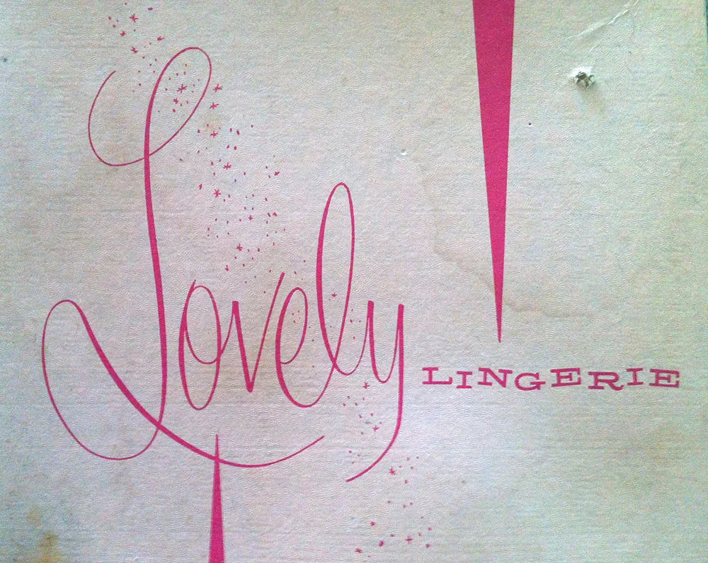 Some lovely lettering seen on a vintage clothing box. Found in a garage sale in July, 2012.