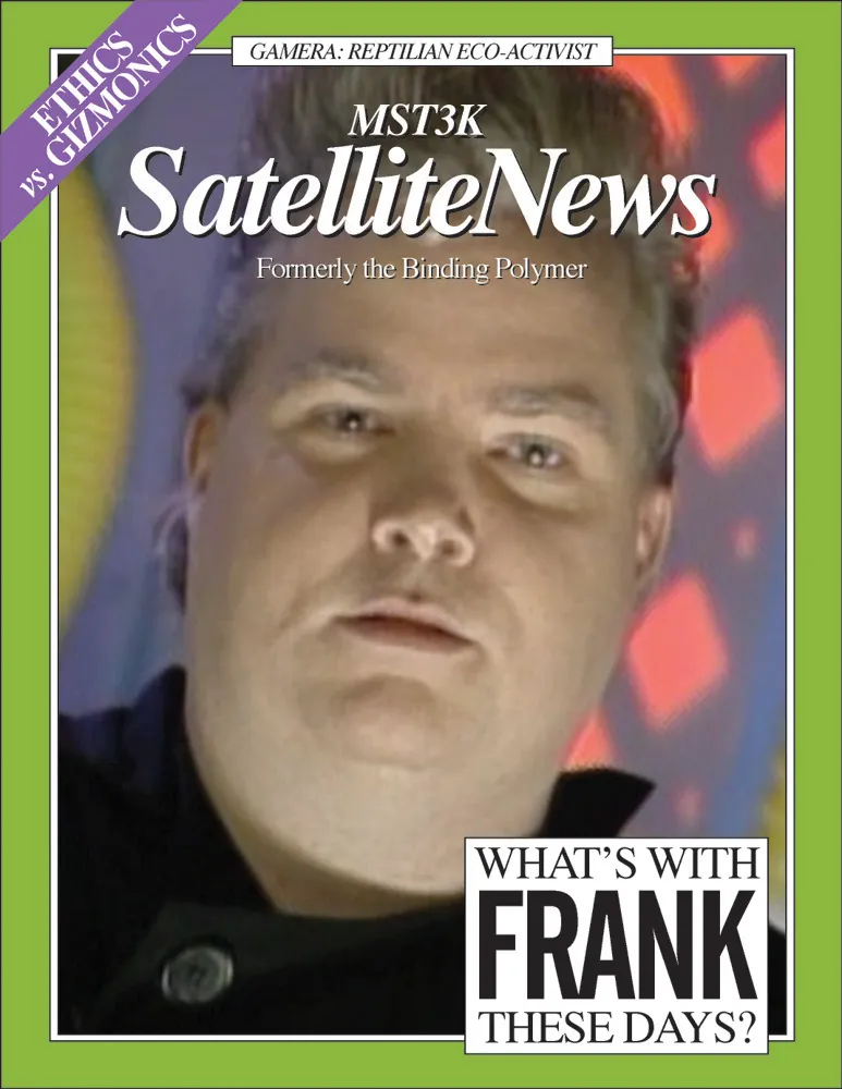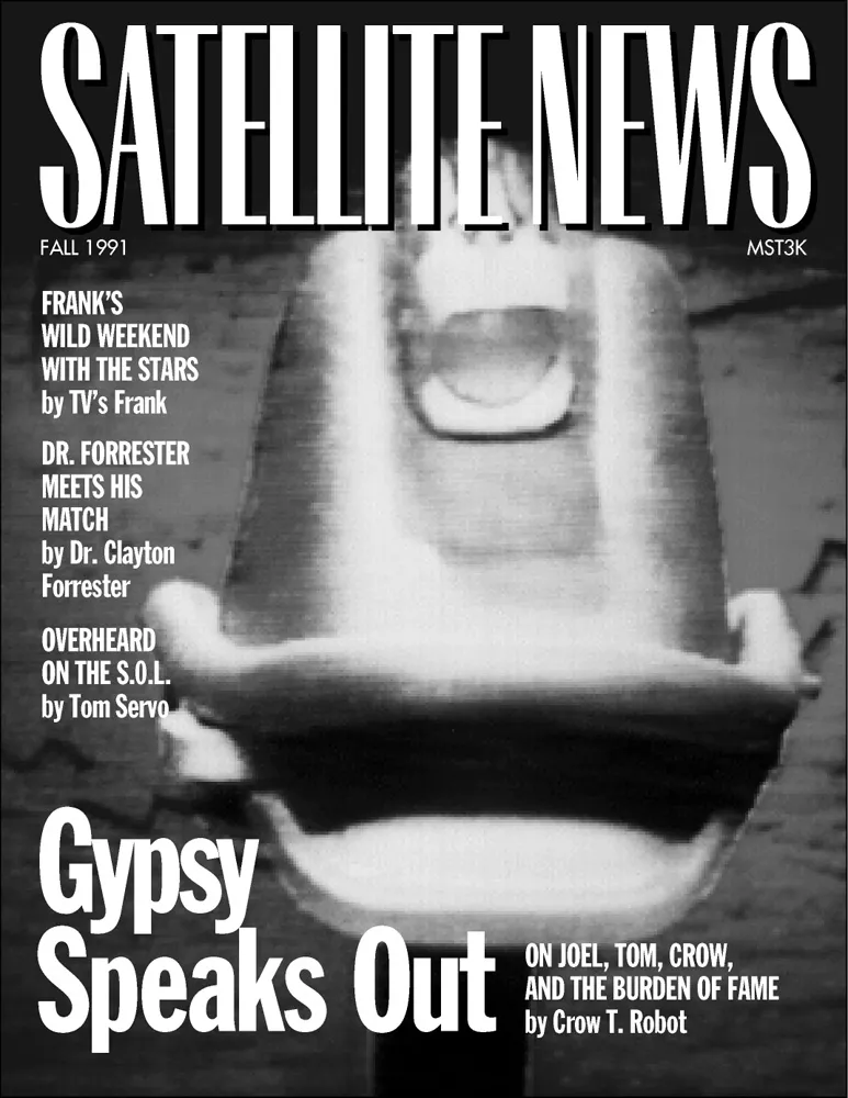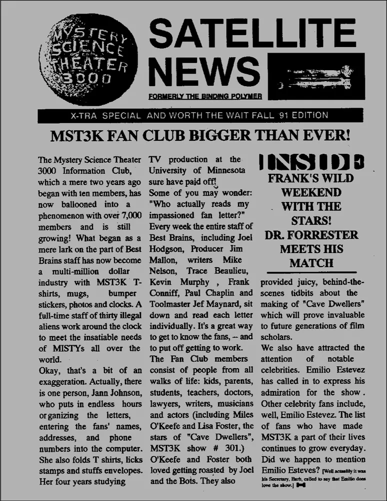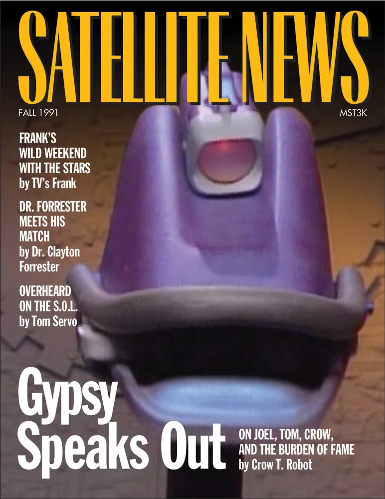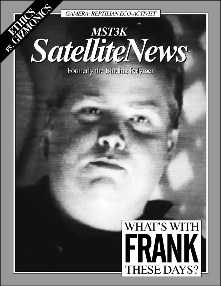 As a graphic designer, I was appalled by the design of the official MST3K fan newsletter, Satellite News (Formerly The Binding Polymer). It was obviously not done by a professional designer. I decided to offer my services—for free, even—to take on design and production of the newsletter. Once they saw what I could do, it would be a slam-dunk. To demonstrate, with the help of a few tapes of the show, an SX-70 camera, an HP ScanJet, Photoshop and Illustrator, and a PostScript laser printer, I did a set of mock “redesigns” of the newsletter. I sent them, along with a cover letter, to Best Brains at the end of October, 1991.