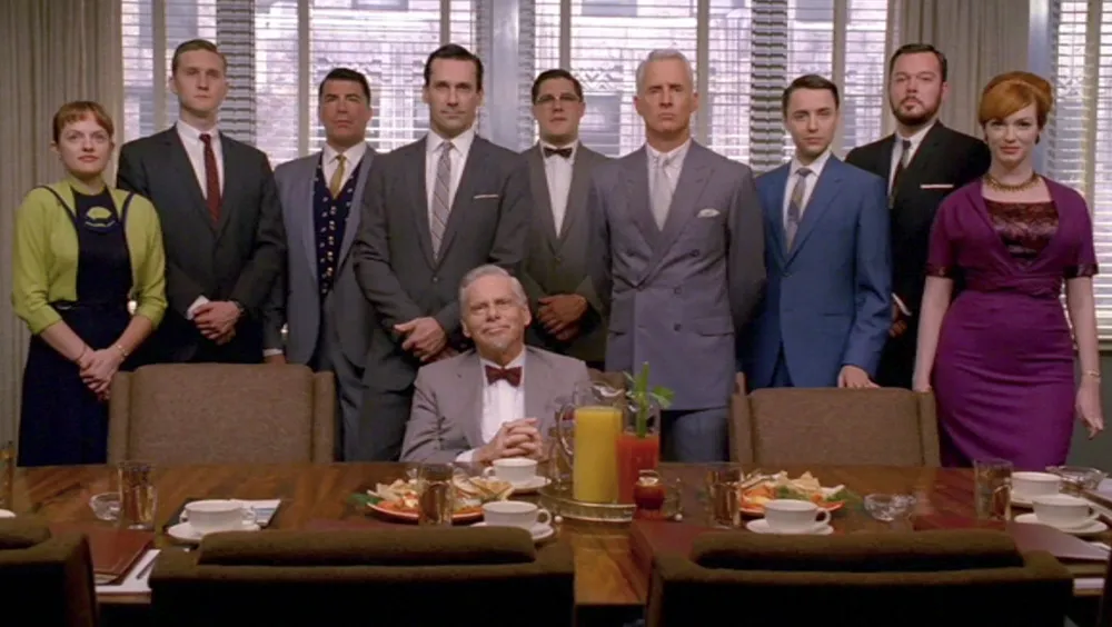 Alert fans have noted that Seventies-era IBM Selectric II typewriters are used on the show, but even these have visible signs of age, such as the yellowed plastic shield you can see in this shot. I wish they would figure out a way to make these props look less aged. I sometimes feel like these characters are living in a retro museum instead of 1960s New York.