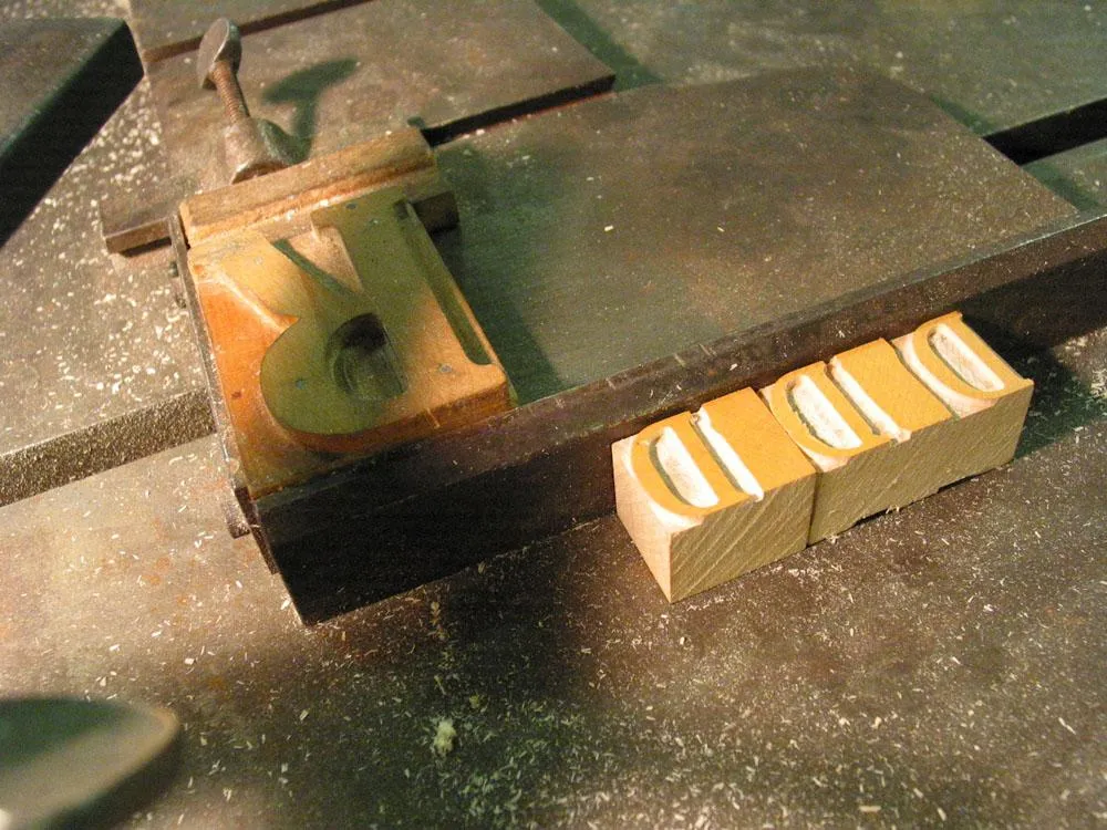 The actual wood type is cut on a pantographic cutter. The cutting blade spins like a router saw. It’s pneumatic and very loud.