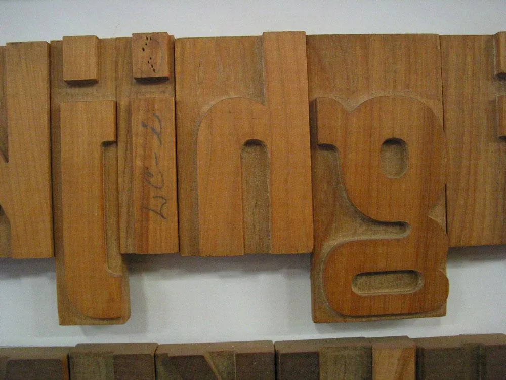 A finished piece of wood type, about an inch tall. Eagle-eyed type nerds may wonder why it’s not backwards. This is a special right-reading font for making souvenir nameplates and such. Also, this piece is not quite finished. Normally, they would go in with a finer cutting blade to make the inside corners sharper.