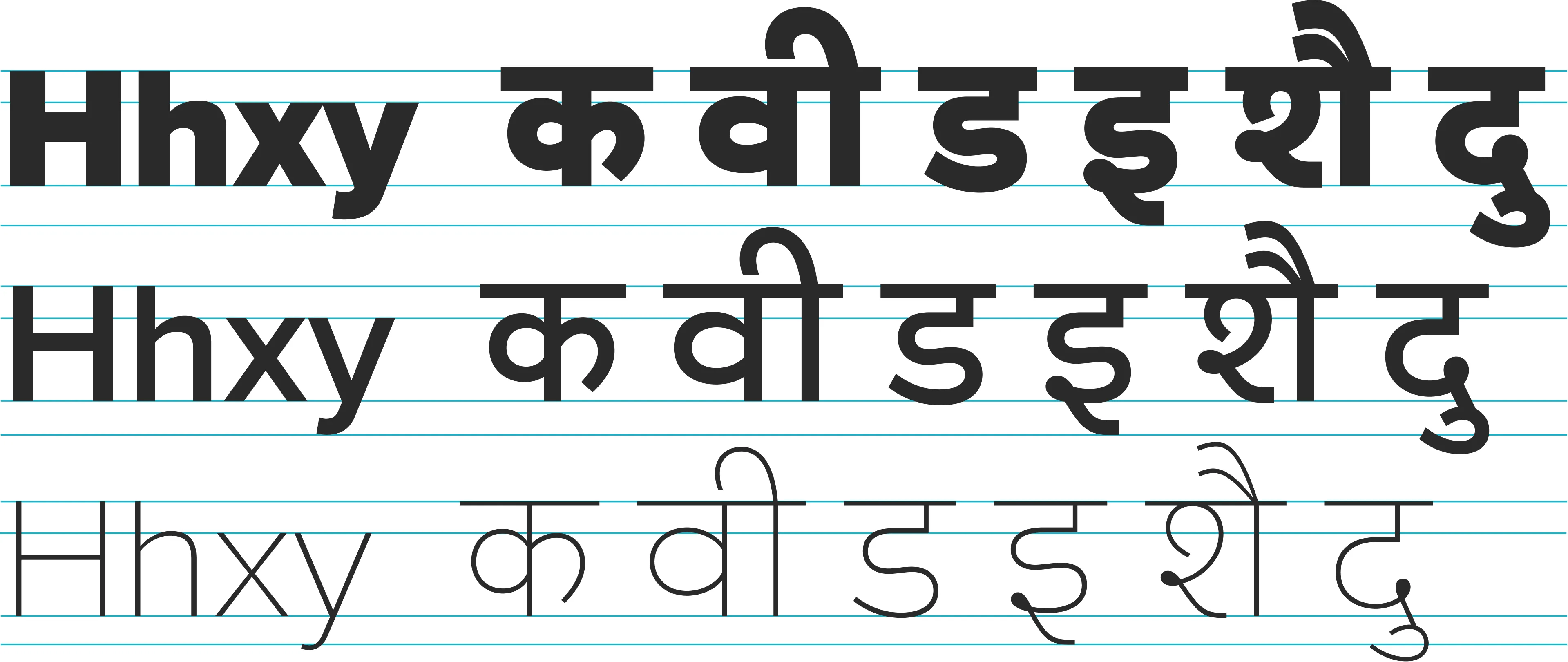 Relative proportions between the two scripts are resolved in a way that provides a comfortable height for Devanagari characters, especially in the heavier weights where the Devanagari headline sits subtly above the ascender height.